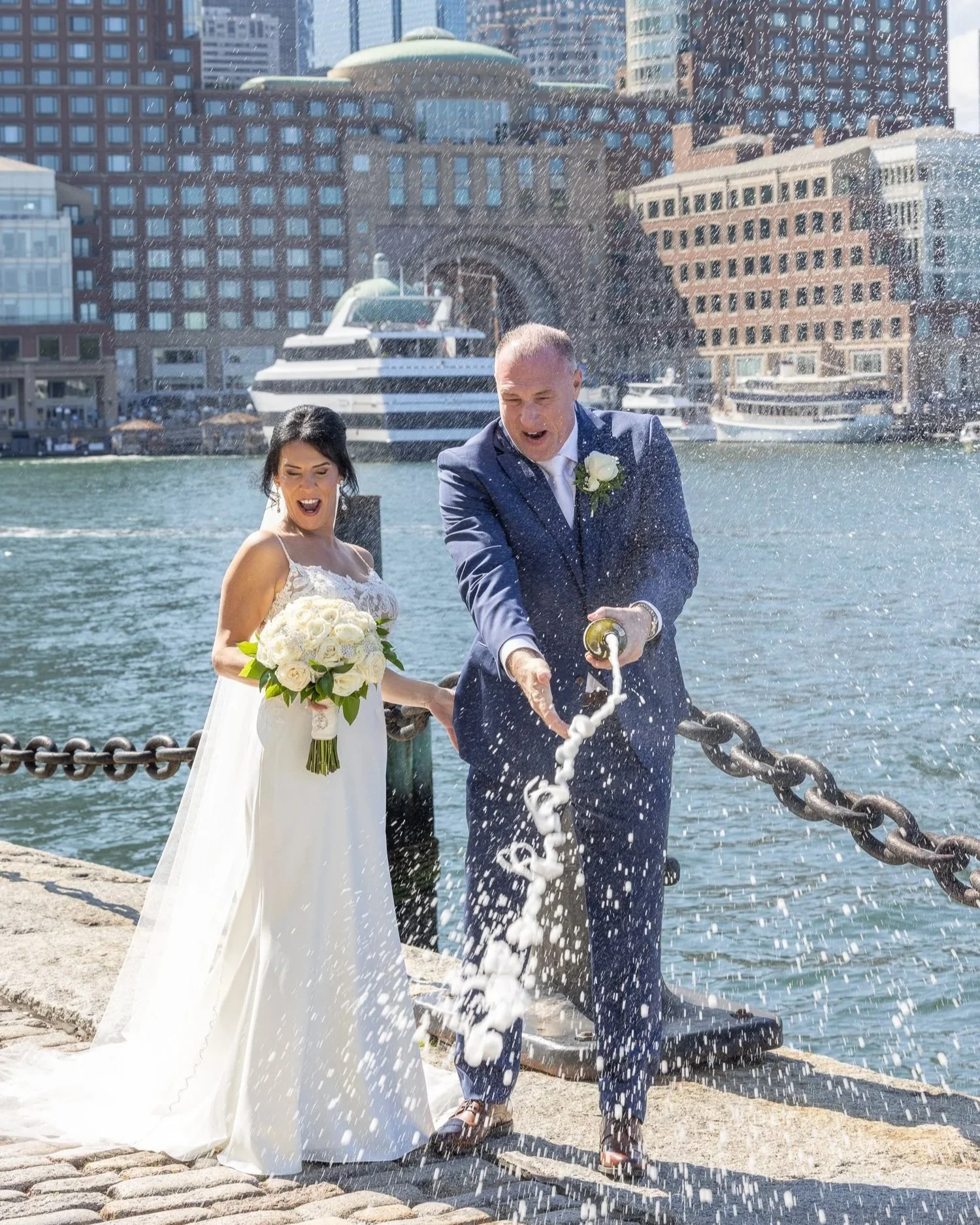 Mae and Mark then made their way back towards the hotel to take more photos with each other and with their close friends and family. These turned out to be lovely images that capture how happy everyone was to celebrate the couple. A favorite photo is of the wedding party all posing together, holding up their arms and flowers, with Mark holding their puppy. This puppy would make an adorable appearance down the aisle later on. Just before the ceremony, the couple headed over to the waterfront to take photos, popping a bottle of champagne. Champagne is always a fun prop, and these images did not disappoint!